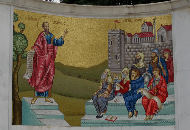 In Berea, modern Varia, there is a beautiful mosaic that depicts the passage from Acts 16. Pictured above, it has Paul standing on an elevated stone and preaching from thee Scriptures to the Bereans who themselves are searching the Scriptures to see if what Paul is saying is actually the truth.