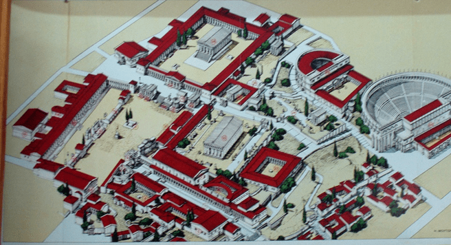 What we have pictured here is an archaeological artist’s rendering of what the layout of the heart of ancient Corinth might have been. This is found in the Corinthian archaeological museum. It gives us the view of the commercial and religious heart of ancient Corinth that an eagle might have had. It was here that the 300,000 Corinthians came to have the needs for life met. There were all sorts of material goods available in the marketplace and the temples provided a smorgasbord of religious choices. One can almost imagine the crowds jostling each other for position near the bakers’ stalls, the fruit sellers, and the other providers of basic necessities.