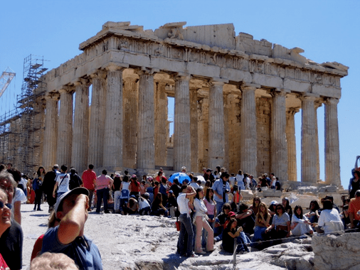 When I stood on the top of the Acropolis in Athens, I was joined in that by hundreds of others. Maybe the numbers even went into the tens of hundreds. All of us were there to admire the graceful work of people who had labored in love for Athena about 2500 years ago. As the tour books all say, this is one spot in Greece you don’t want to miss. Therefore, every tourist makes a pilgrimage to the mountain, climbs the steps to the top, and gazes at the massive marble pillars; their graceful appearance even after all these centuries very apparent. There are no straight lines in the construction of the Parthenon, despite the apparent symmetry. All columns narrow slightly to create a visual harmony. The Parthenon was built with a marble that contains some iron. This causes it to glow with a subtle golden color as the sun sets.