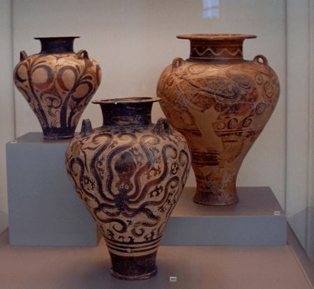In our travels around the country of Greece, we visited many museums. In each of them were examples of the beautiful handiwork of ancient artisans in the making of jars of clay. What was so amazing was how easily these jars were made. One needed good soil, some water and skill and, behold, a ceramic piece could be built. From there it was decorated and fired. Pictured here are some pots in the archaeological museum of Athens. The center one is “a three handled Palace Style amphora with three large octopuses within a marinescape of rocks and seaweed. A Mycenean imitation of the Minoan Marine Style … 15th century B.C.” Let’s see, these jars of clay are from about 3500 years ago. They have withstood the ravages of time by being buried in a tomb with provisions for the life that was to come.