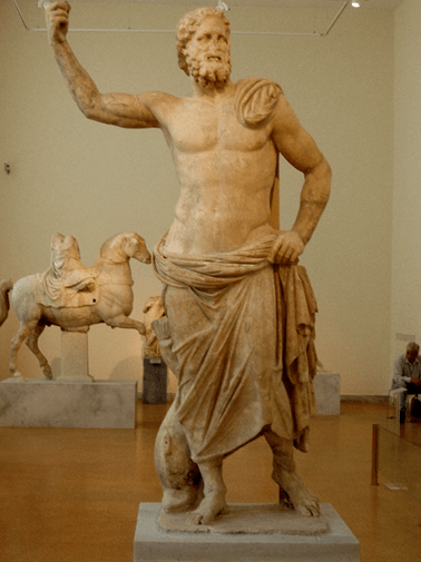 Poseidon was the God of the sea in the Greek pantheon. Here he is shown with some clothing on, but a more typical statue of Poseidon was nude. Also, in his right hand would have been a trident, his usual weapon of choice. He is shown in this pose from about 100 B.C. in a more relaxed position. Why? His seaways were, by this time, dominated by Roman men-o-war. He was, therefore, sidelined with no one to threaten or challenge anymore. He had, we might say, become obsolete.