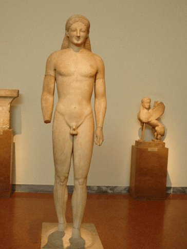 As the ancient Greeks sought to honor their gods, they would make these statues which are thought to have been made in the image of Apollo. Although that idea is debated, one can see in the image an attempt at portraying what the gods looked like. For, upon careful examination, the kouros, as statues of this sort are called, is not really like a human being. In fact, this cannot have been a sculpture that is based on a human being since the proportions are not like any human being that exists. The following paragraph is from a college handbook about the kouros sculptures: